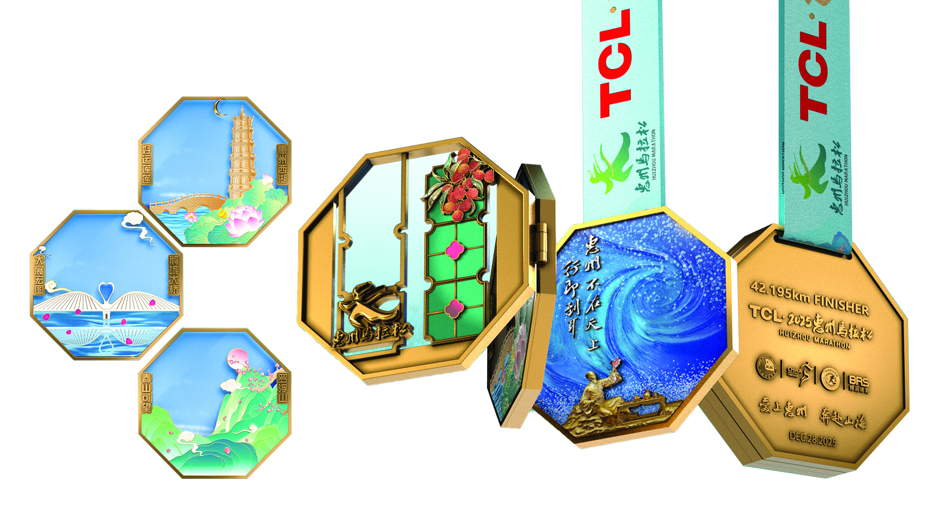 這份千年的文化基因,被深度編織進賽事的每一個細節。本屆賽事繼續以“暢跑山海惠州,盡享東坡文化”為主題,以“惠州不在天上,行即到耳”為口號,視覺形象和精神內核全面浸潤東坡風雅。參賽服取意“紫氣東來”,上面奔跑的東坡形象和他最愛用的“呵呵”二字,仿佛在告訴每一位跑者:人生緣何不快樂?且學東坡灑脫奔跑。完賽獎牌則如同一份精致的嶺南禮物:延續三折疊設計,創新融入幸運盲盒,內含三款可拆卸冰箱貼,分別以“大展宏圖”的鵝城大橋、“好事蓮蓮”的惠州西湖和“春山可望”的羅浮山為造型,寓意跑者“跑過山海,所愿皆達”。