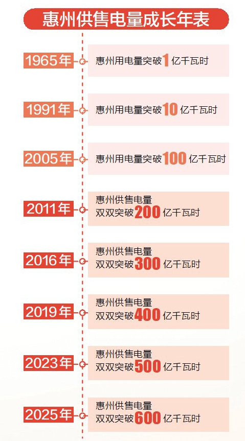 時間軸拉長來看,自2005年惠州用電量首次突破100億千瓦時以來,20年時間里,惠州供售電量先后邁上多個百億臺階,并且用時越來越短:從100億千瓦時邁向200億千瓦時,用了6年時間;而從500億千瓦時邁向600億千瓦時,僅用了2年時間。不斷縮短的跨越周期,精準反映出惠州特別是“十四五”以來經濟社會日新月異的發展。電力增長的曲線,成為觀察惠州這座城市經濟活力、產業轉型與未來潛力的關鍵刻度。
