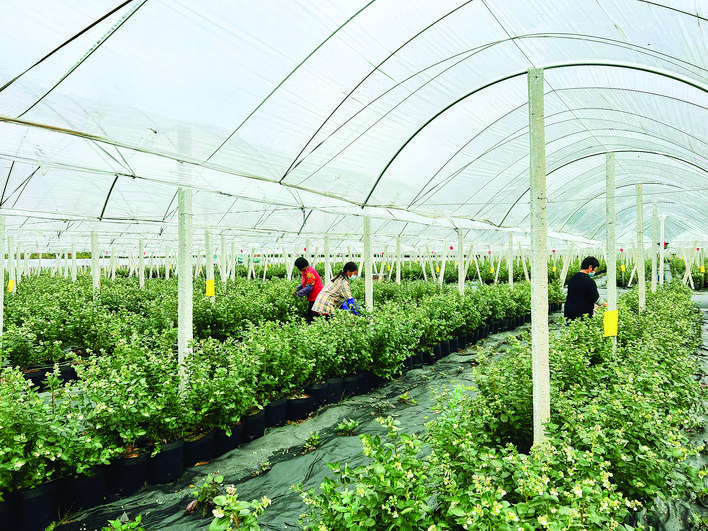 東勝村藍(lán)莓種植基地里工人在忙碌。
