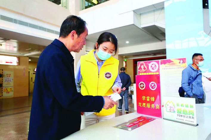 醫(yī)院志愿者熱心幫助市民就醫(yī)。惠州日報(bào)記者張藝明 攝